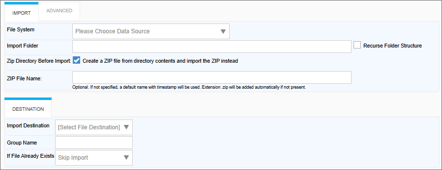| Zip Directory Before Import | Added in v2025.10.28, this property enables you to specify that all contents in the specified file system directory should be converted to a zip archive, and will import the Zip archive, instead of the raw files. | |
