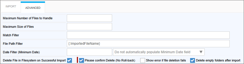 This is a two-part option. The Textbox allows you to specify a minimum file date to import, while the dropdown enables the selection of how to populate the minimum date field. |