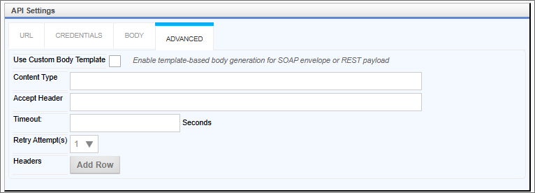 | Use Custom Body Template | When checked, the Custom Body Template field will be displayed to enable you to provide template-based body generation for the SOAP envelope or REST payload. | |