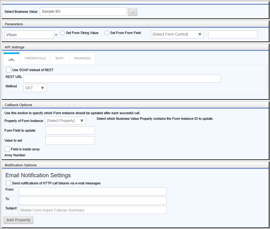 | Add Property | When clicked, this button will add a new property row to this section, to enable you to append the values of Business Value Properties to the body of the email notification. | |