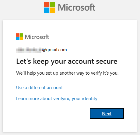The first step in the process presents you with an informational window with a link to use a different account, which you should not click, since you'll already be logged into your email account. There’s also a link that will open an information page about the identity verification process in a new window.