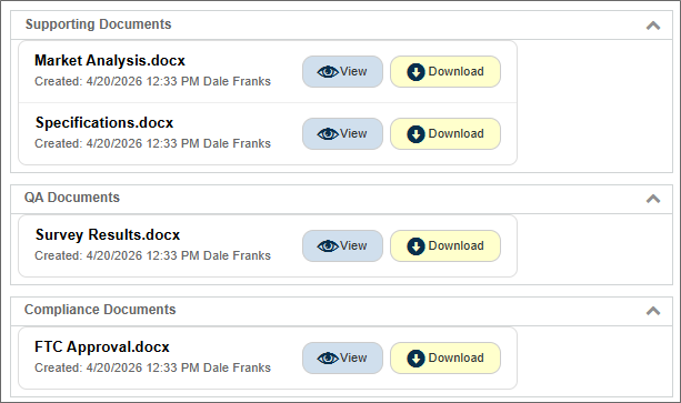 In this example, there are three different types of documents that need to be attached to the process or Form. While a single set of Attach Objects and Show Attached Objects controls will allow everyone to upload their documents, they would all be collected in a single set of attachments. The Group Name property enables you to place three sets of attachment controls on the Form, each with a different group name, so that each set of people can upload documents into a Form section that is specific to their group. The first set of Attach Objects and Show Attached Objects controls might have the Group Name "SupportingDocs", the second set would have theGroup Name "QA", and the third set might have the Group Name "Compliance". With this configuration, you can allow each group of people to upload documents only to the Group that is relevant to them, while disabling or hiding the other attachment groups, as desired, when the Form is being edited. As long as an Attach Objects control and a Show Attached Objects control share the same Group Name, Process Director will organize the attachments properly by group.
