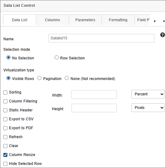 Virtualization Type: In order for the Data List control to handle large numbers of records without affecting performance or using excessive memory, the Data List control provides two options for controlling when records are rendered visible on the page: Visible Rows and Pagination. A third option, None, will not invoke any virtualization for the data.