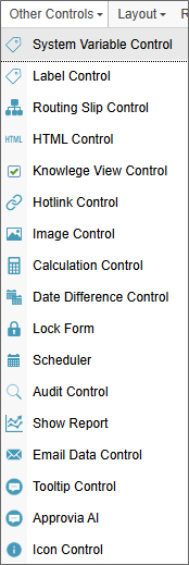 The following controls are available from the Other Controls control menu dropdown in the online Form Designer.