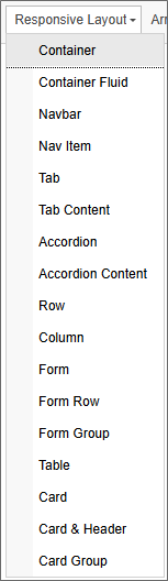 Use of the Responsive Layout controls requires that the fIncludeBootstrap custom variable be set to True. If this variable isn't set to True, the Responsive Layout controls menu won't appear in the UI of the Online Form Designer.