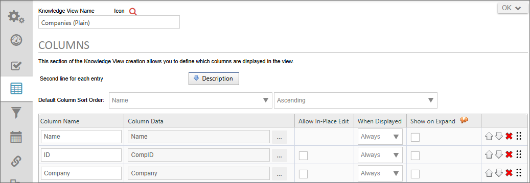 The Columns tab defines the columns to display in the Knowledge View. The column data can include form fields, process data, Meta Data, or various object properties. The order of the columns can be changed using the up arrow