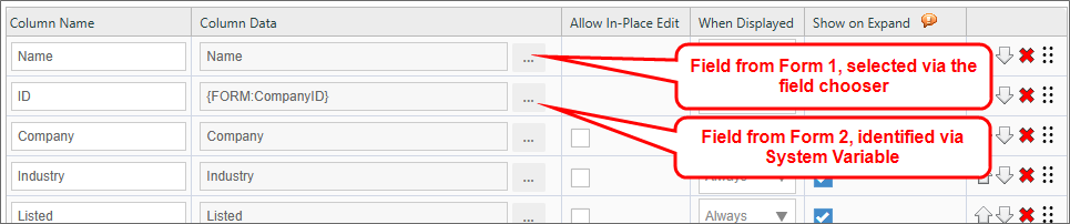 If the Knowledge View returns data from two different Form definitions, you can mix the use of the Form Field Picker and FORM system variables. Process Director will correctly parse the system variables to return the appropriate data.