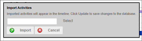 A Select button will open your computer's File dialog to enable you to search for and select an XML export file of Timeline activities from its location on your system. Once selected, clicking the Import button will import the XML file into your timeline, and create the activities inside the timeline definition. You can then move the activities, change their dependencies, or make other changes that may be required to configure them properly inside the Timeline definition.