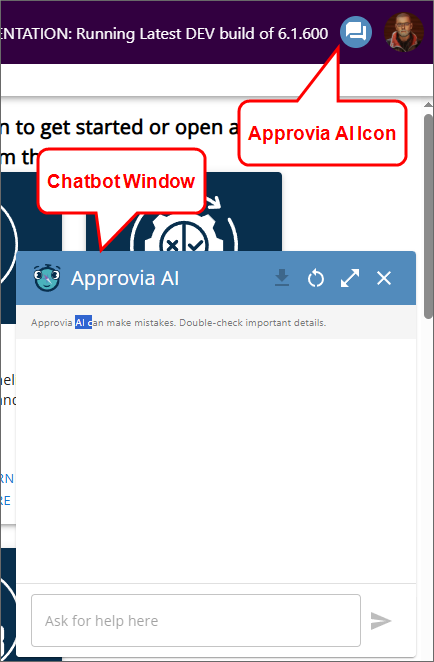 From the user's perspective, Approvia AI will appear as an additional icon placed to the left of the User Profile icon. When clicked, this icon will open a chatbot window for the Approvia AI agent.