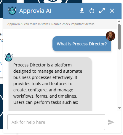 Approvia AI is a separately licensed component, and administrators will need to work with BP Logix to enable and configure Approvia AI for use. Approvia AI can be trained on both Process Director's documentation, as well as on any documentation you may have for complex applications that you create on your installation. Please speak with your BP Logix Account Manager if you have any questions about Approvia AI licensing or costs.