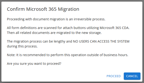 The migration process will review the Form Definitions on your system, looking for any Attach Object control that have the Enable Microsoft 365 CDA property checked. When found, it will transfer document attachments in all instances of that Form/Process definition from local storage, and place them in M365.