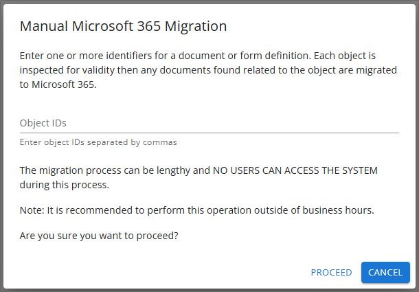 In the Object IDs field, you can enter the Object ID for a single definition, or add multiple Object IDs, separated by a comma. Once you supply the Object ID(s), you can click the Proceed button to begin the migration. As always, you can also click Cancel to escape the migration.